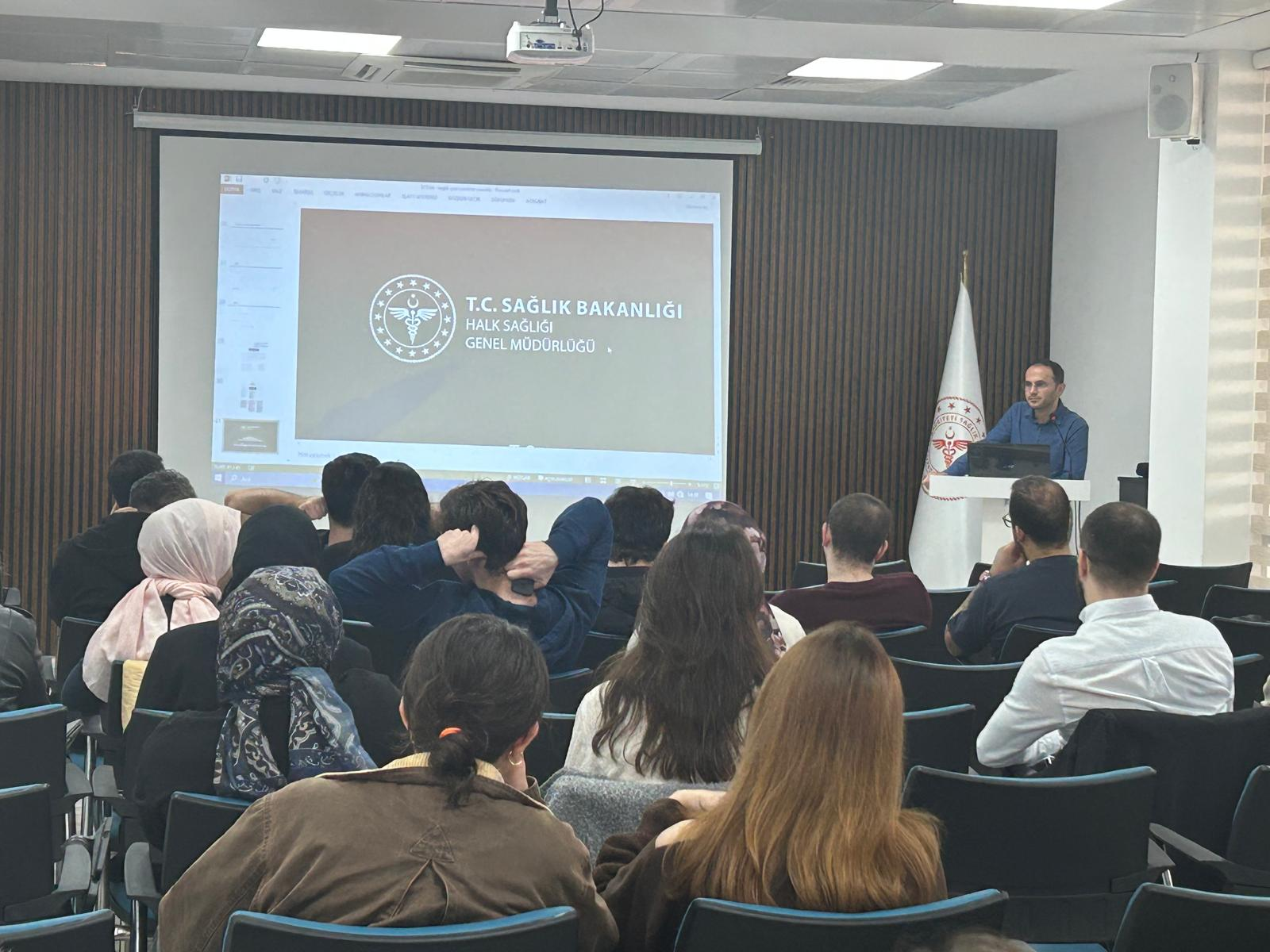Sağlıklı Hayat Merkezi Konferans Salonu’nda 24 Nisan 2026 tarihinde gerçekleştirilen eğitim, İl Sağlık Müdürlüğü Bulaşıcı Hastalıklar Birim Sorumlusu Uzm. Dr. Ali Rıza Coşkun tarafından sunuldu.