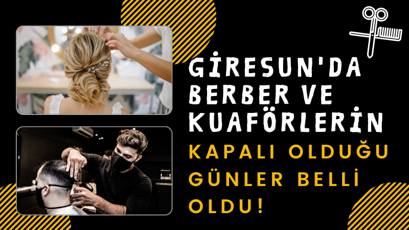 Ticaret Bakanlığı'ndan Giresun'a gelen yazı doğrultusunda Giresun Berberler ve Kuaförler Odası Başkanı Ayhan Konar tarafından yapılan açıklamada Giresun ve ilçelerinde berber, kuaför ve güzellik salonlarının kapalı olacağı günler belli oldu.
