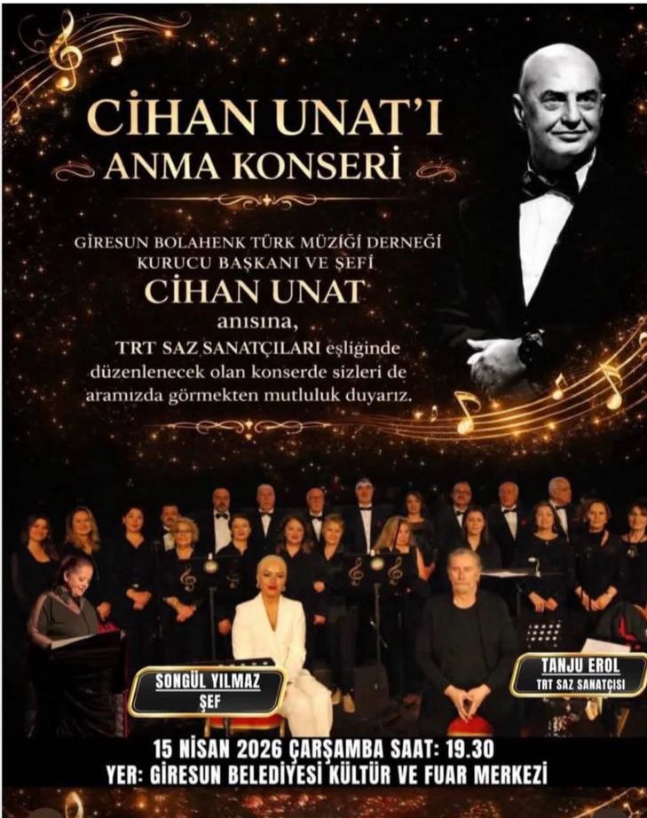 Düzenlenecek özel bir konser programıyla anılacak. Giresun Bolahenk Türk Müziği Derneği’nin kurucu başkanı ve şefi olan Cihan Unat için gerçekleştirilecek anma konseri, sanatseverleri anlamlı bir gecede buluşturacak.