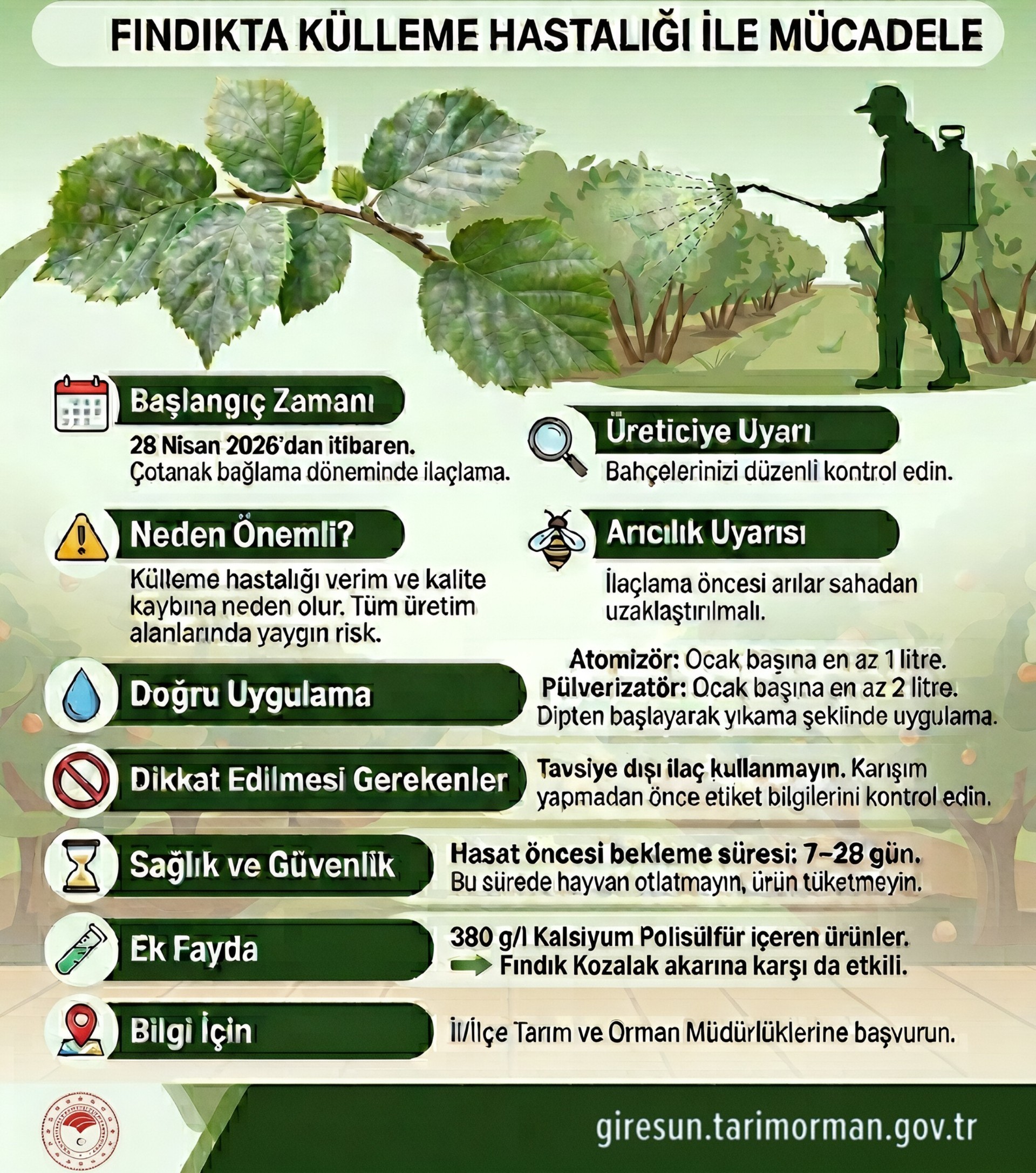 Fındık bahçelerinde büyük zarara yol açan fındıkta külleme hastalığına karşı ilaçlı mücadele döneminin başladığı duyuruldu. Yetkililer, üreticilerin 28 Nisan 2026 Çarşamba gününden itibaren bahçelerini takip ederek, fındığın meyve (çotanak) bağlama döneminde ilaçlamaya başlayabileceklerini bildirdi.
