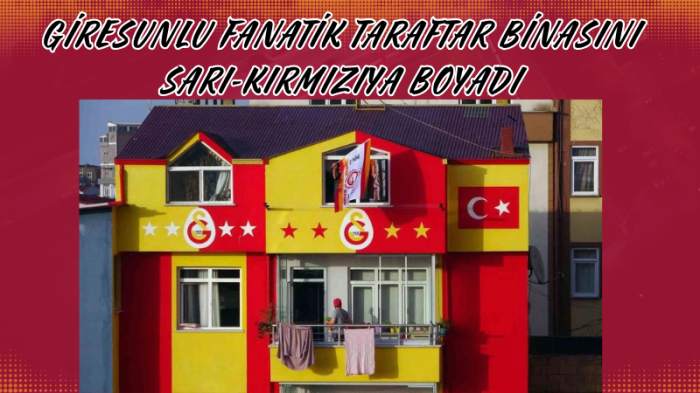 Giresun Yenimahalle’de yaşayan Mustafa Bayraktar, Galatasaray’ın Süper Lig’de 24. kez şampiyon olması ve takımına olan sevgisi nedeniyle 5 katlı binayı 60 kilo boya kullanarak sarı ve kırmızı renklere boyattı. Bayraktar, ayrıca binanın duvarlarına Galatasaray logosunu ve 4 yıldızını da yapmayı ihmal etmedi.