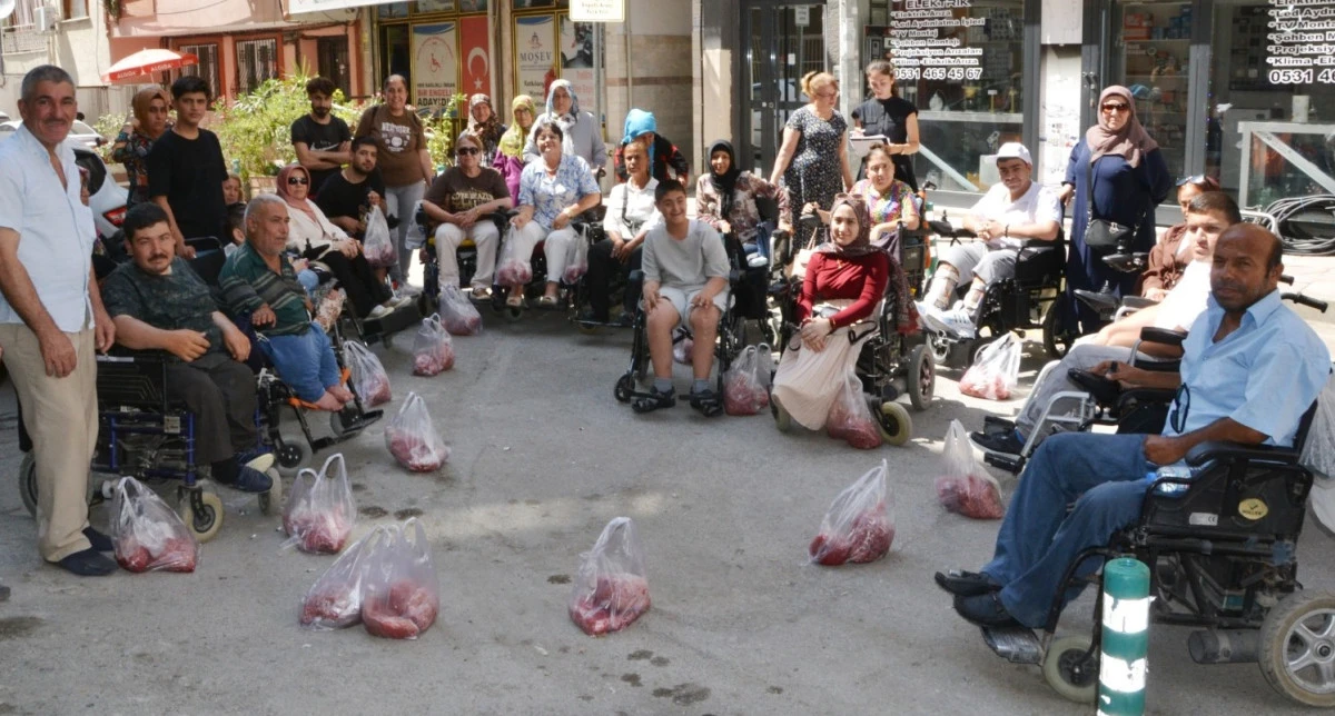 Manisa Bedensel Engelliler Derneği, gurbetçi hayırsever iş adamı ve arkadaşları tarafından bağışlanan kıyma ve kuşbaşı etleri 110 engelliye dağıttı.