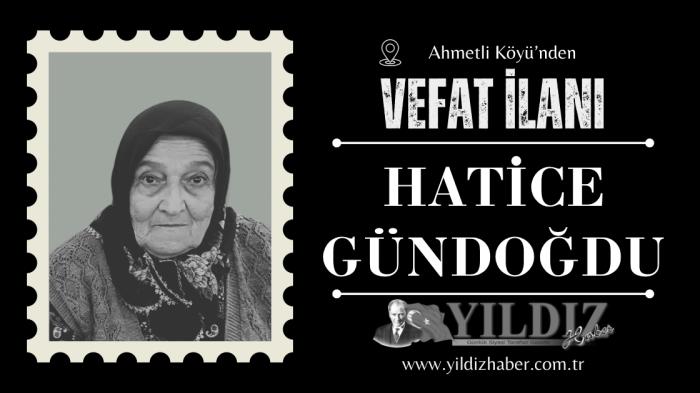 Ahmetli Köyü’nden Hıdıroğulları’ndan merhum Cahit Gündoğdu’nun eşi; Tezel Bay, merhum Nail, Nahit ve Bulancak esnaflarından Nayim Gündoğdu’nun anneleri; Ahmetli Köyü muhtarı İsa Gündoğdu’nun babaannesi Hatice Gündoğdu vefat etti.