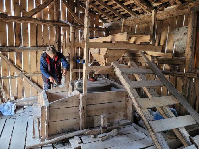 Değirmeni işleten 60 yaşındaki Adil Çağlayan, tahılını öğütmek amacıyla getirenden para yerine undan pay alıyor.