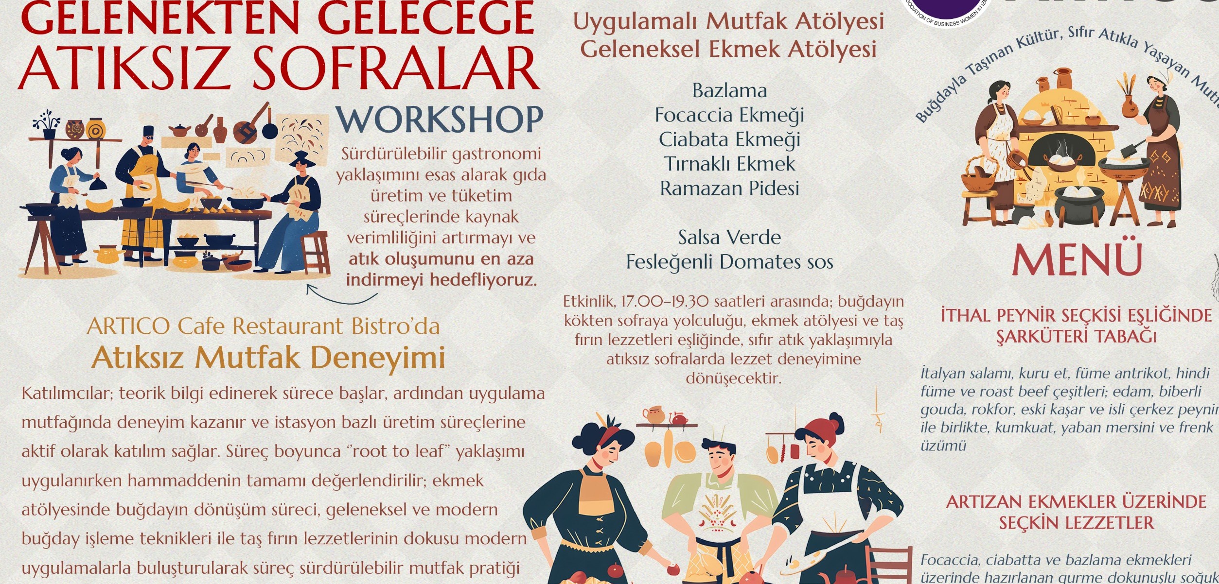 Hayata geçirilen Gelenekten Geleceğe Atıksız Sofralar Workshop etkinliğinde, gastronomi dünyasında giderek önem kazanan sıfır atık yaklaşımı ele alındı. Sürdürülebilir gastronomi yaklaşımıyla kurgulanan atölyede, geleneksel üretim tekniklerinin modern mutfak disiplinleriyle nasıl harmanlanabileceği teorik ve uygulamalı olarak aktarıldı. Katılımcıların üretim süreçlerine dahil olduğu etkinlikte, geleneksel ekmek atölyesi de yapıldı.
