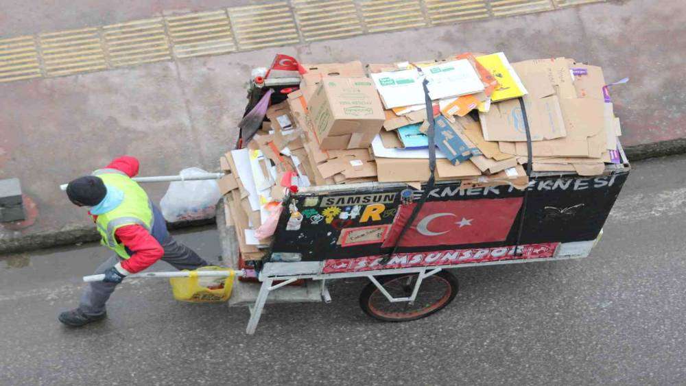 Samsun’da kağıt toplayıcısının "Ekmek Teknesi" yazan çekçek arabası görenleri tebessüm ettiriyor.