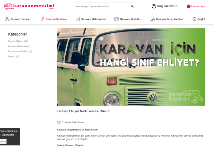 Karavan Ehliyeti Karavan ehliyeti belirli türdeki büyük ve ağır karavanları kullanabilmek için gereken özel bir sürücü belgesidir. Genellikle D1E veya benzeri kodlarla ifade edilen bu ehliyet standart sürücü belgesinden farklıdır ve belirli bir ağırlık ve boyuttaki karavanları kullanma yetkisi verir. Karavan ehliyeti alabilmek için genellikle belirli bir yaş sınırı sağlık kontrolü ve özel bir sürücü kursunu başarıyla tamamlama gerekliliği bulunabilir. Bu ehliyet kullanıcıya daha büyük ve ağır karavanları yönetme yeteneği sağlar bu da genellikle geniş aileleri veya uzun süreli seyahat edenleri hedef alan karavan modellerini içerir. Karavan ehliyeti sürücülere daha fazla taşıma kapasitesi ve karavan tipine uygun araç kullanma becerisi kazandırarak güvenli sürüş koşullarını sağlamak için önemlidir. Bu ehliyete sahip sürücüler büyük karavanları sorunsuz bir şekilde kullanabilir ve seyahat deneyimlerini daha keyifli hale getirebilirler. Karavan Ehliyeti Kimler Alabilir? Karavan ehliyeti genellikle belirli bir ağırlığın üzerindeki ve belirli boyutlara sahip karavanları kullanmak isteyen sürücüler için gereklidir. Almanya'da B sınıfı bir sürücü belgesi ile belirli bir ağırlığa kadar olan karavanları kullanmak mümkündür. belirli bir ağırlığı aşan veya belirli bir toplam ağırlık sınıfına giren karavanları kullanmak isteyen sürücülerin D1E veya DE kategorisinde bir sürücü belgesine sahip olmaları gerekebilir. Karavan ehliyeti alabilmek için genellikle belirli bir yaş sınırı bulunur ve bir sağlık kontrolü geçmek gerekebilir. bazı ülkelerde özel bir sürücü kursunu başarıyla tamamlamak da gerekebilir. Karavan ehliyeti sürücülere belirli bir büyüklükteki ve ağırlıktaki karavanları güvenli bir şekilde kullanma yetkisi sağlar bu da genellikle geniş aileler veya uzun süreli seyahat edenleri hedef alan karavan modellerini içerir. Karavan Ehliyeti Almanın Şartları Almanya'da karavan ehliyeti almak için belirli şartlar bulunmaktadır. Almanya'da genellikle B sınıfı sürücü belgesi ile belirli bir ağırlık ve boyuttaki karavanları kullanmak mümkündür. Eğer karavanın toplam ağırlığı 3.500 kilogramı aşıyorsa veya karavanı çeken araç ve karavan toplamda 4.250 kilogramın üzerindeyse D1E veya DE kategorisinde bir sürücü belgesi gereklidir. Almanya'da karavan ehliyeti almak isteyenlerin genellikle 18 yaşını doldurmuş olmaları ve sağlık kontrolünden geçmiş olmaları beklenir. https://www.karavanmevsimi.com/karavan-ehliyeti-nedir-ve-nasil-alinir/ Bu özel sürücü belgesini almak isteyenlerin bir sürücü kursunu başarıyla tamamlamaları ve sürücü sınavını geçmeleri gerekmektedir. Karavan ehliyeti sürücülere belirli bir büyüklükte ve ağırlıkta karavanları güvenli bir şekilde kullanma yetkisi sağlar bu da genellikle büyük ve ağır karavanlarla seyahat etmek isteyenleri hedef alır.