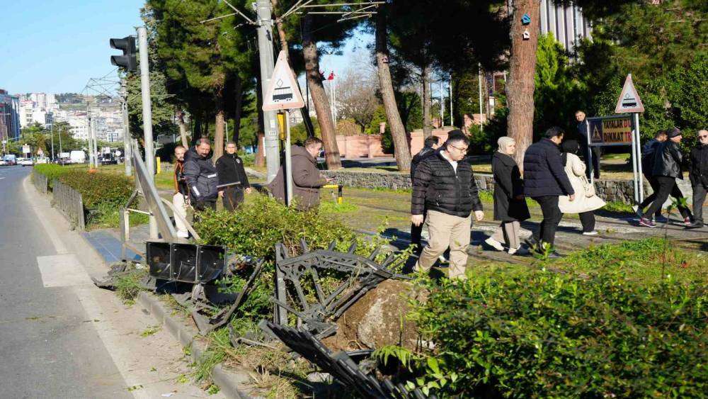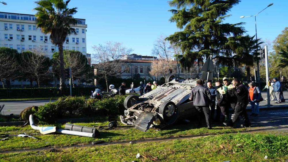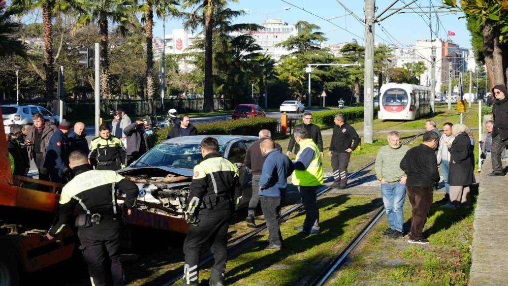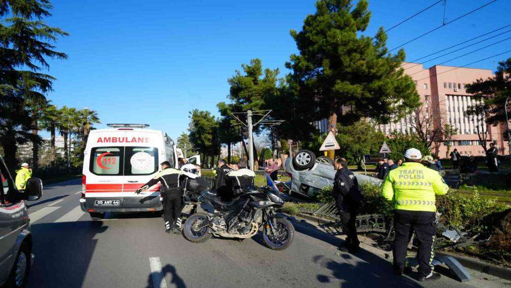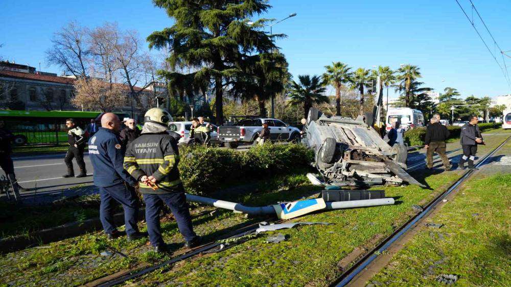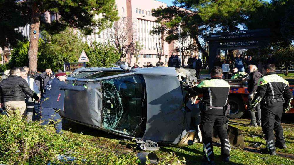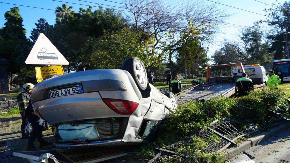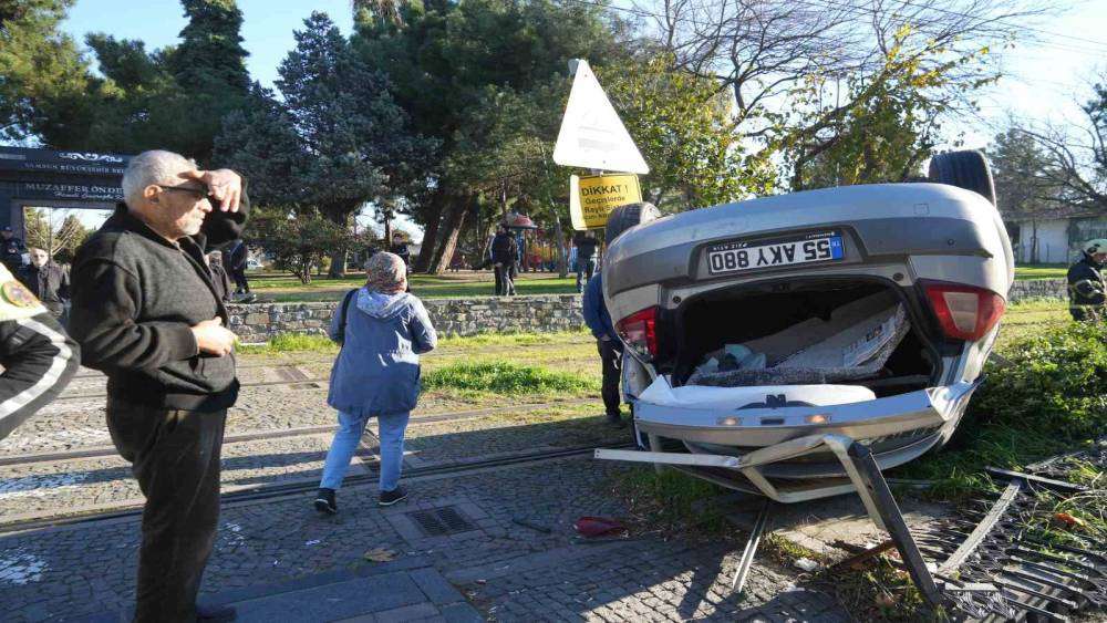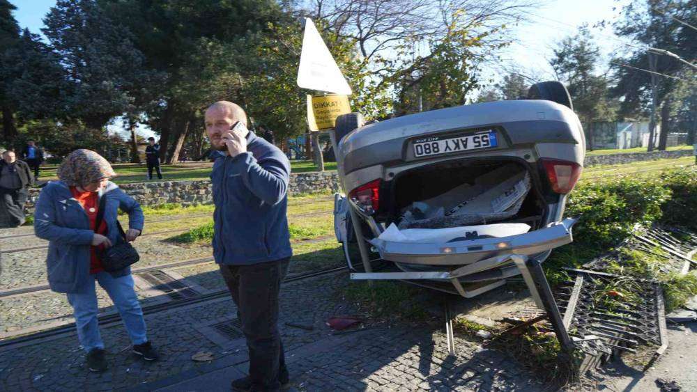 Samsun’da başka bir araçla çarpışan otomobilin tramvay hattına devrildiği kazada facianın eşiğinden dönüldü.