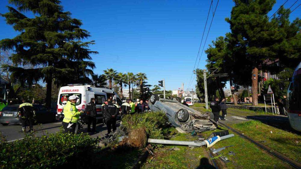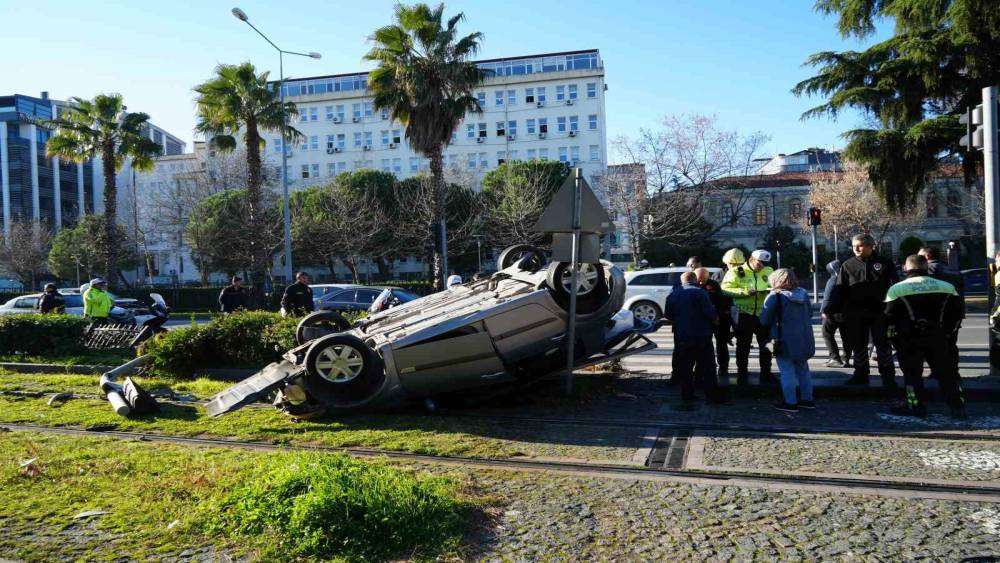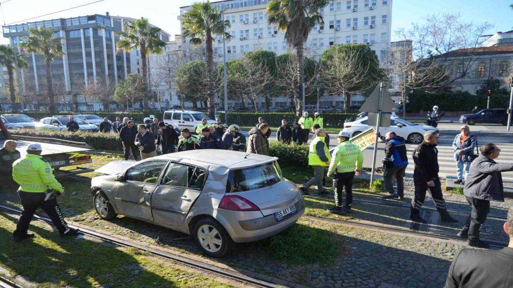Kazaya karışan otomobil tramvay yoluna devrildi, facianın eşiğinden dönüldü