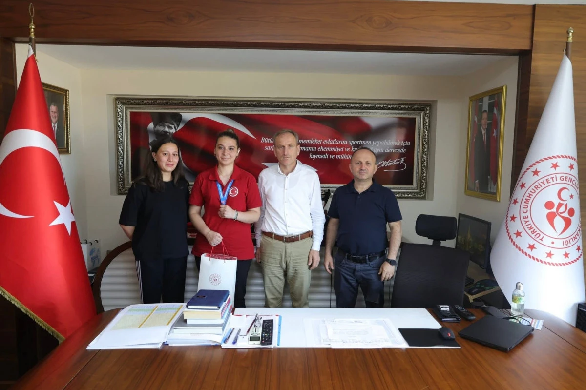 Türkiye üçüncüsü olan sporcumuz Naz Topuzoğlu ile antrenörü Beyzanur Kırım, Gençlik ve Spor İl Müdürü Muzaffer Ergün’ü ziyaret etti.