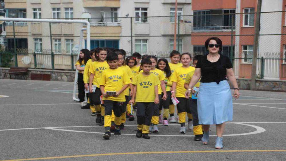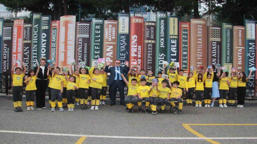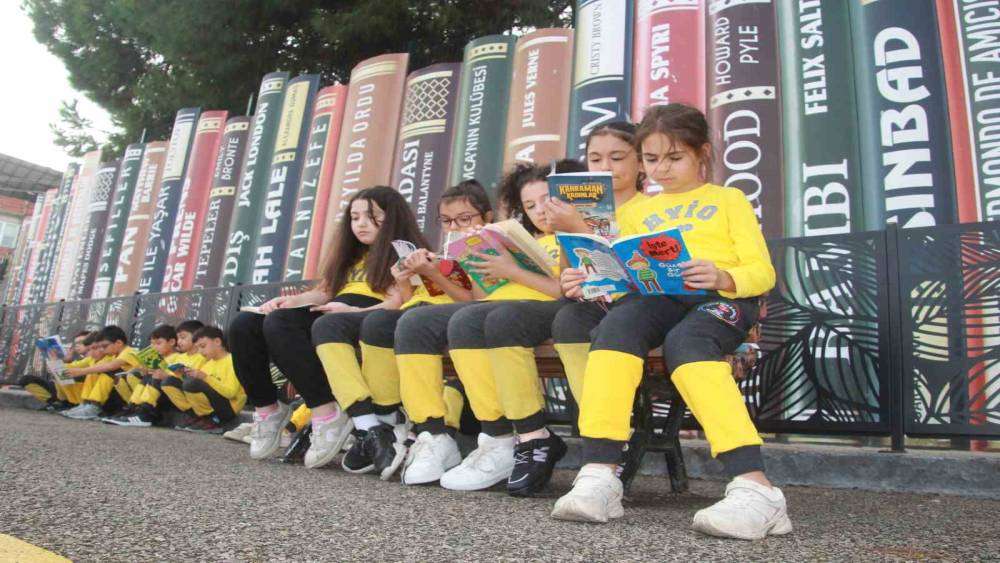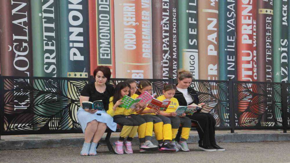Ordu’daki bir ilkokulun bahçesinde bulunan istinat duvarlarındaki kitaplık dekoru, öğrencileri kitap okumaya teşvik ediyor.
