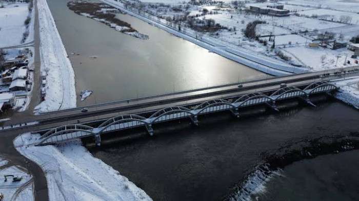 Beyaz örtüyle kaplanan nehir çevresi ve 1937 yılında inşa edilen 7 kemerli, 250 metre uzunluğundaki köprü dronla görüntülendi.