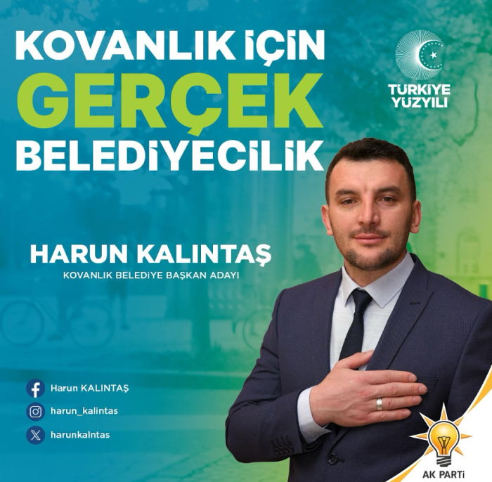 AK Parti Kovanlık Belediye Başkan Adayı Harun Kalıntaş: "Bizim gözümüz de gönlümüz de hep milletimizdedir. Yolumuz da hep milletimizle aynı istikamettedir." dedi.