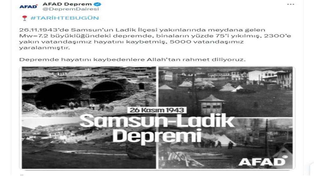 "26 Kasım 1943’te Samsun’un Ladik ilçesi yakınlarında meydana gelen 7.2 büyüklüğündeki depremde, binaların yüzde 75’i yıkılmış, 2 bin 300’e yakın vatandaşımız hayatını kaybetmiş, 5 bin vatandaşımız yaralanmıştır. Depremde hayatını kaybedenlere Allah’tan rahmet diliyoruz."