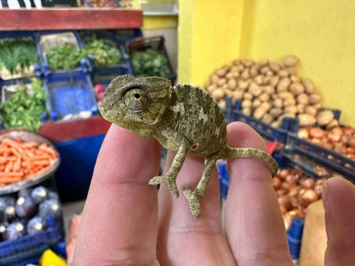 Öte yandan tezgahından bukalemun çıkan manav, mandalinaların bulunduğu kasaların üzerine, "Dikkat bukalemun çıkabilir" yazısı koydu.