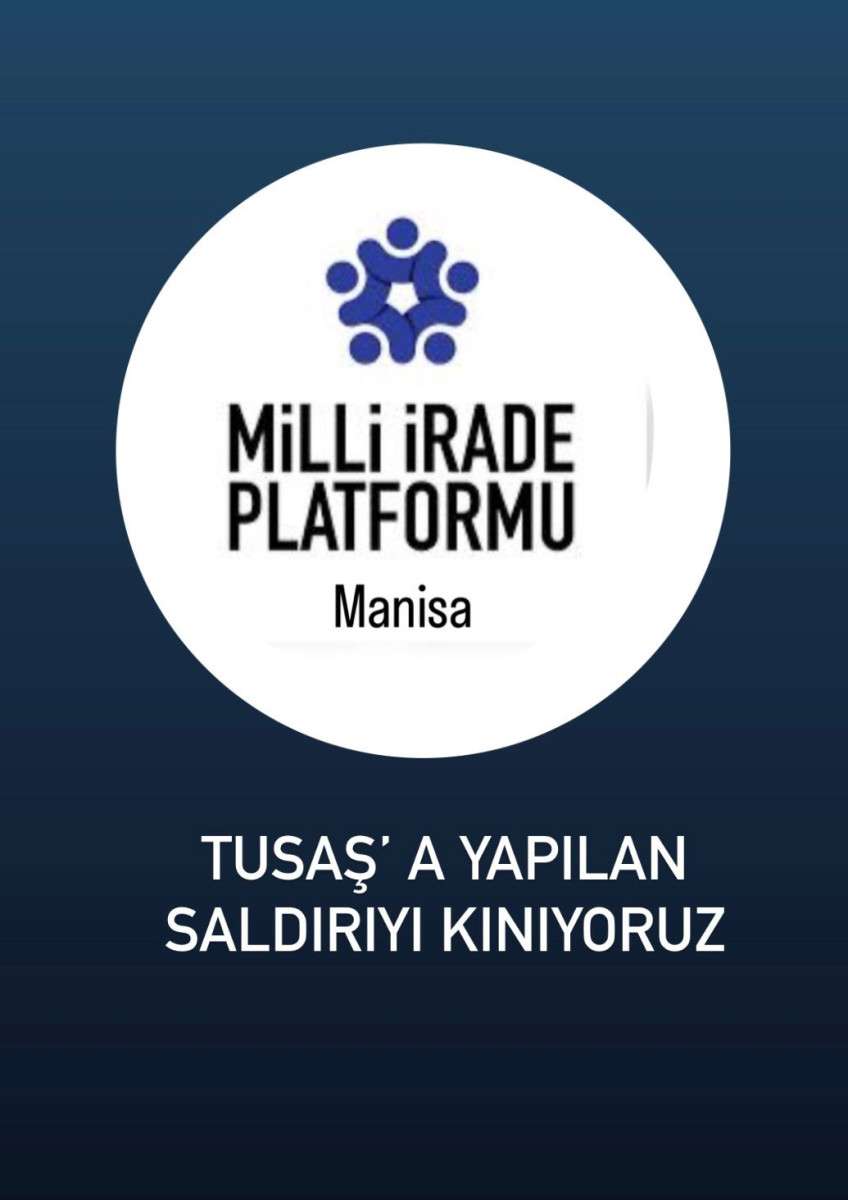 Manisa Milli İrade Platformu Dönem Başkanı Muzaffer Yurttaş, “Türk Havacılık ve Uzay Sanayii Anonim Şirketi'nin (TUSAŞ) Ankara'nın Kahramankazan ilçesindeki tesislerine yönelik terör saldırısında 5 şehidimiz ve yaralılarımız olduğu haberini üzülerek aldık. Tehditle, terörle huzur ve güvenliğimize kasteden, korku iklimini hakim kılmak isteyenler asla hedeflerine ulaşamayacaklardır. Saldırı sadece TUSAŞ’a değil tüm savunma sanayimizedir. Birlik ve bütünlüğümüzedir. Saldırının tetikçisi teröristler, organize edenler alçak küresel güçlerdir. Teröre, destekçilerine ve arkasındaki karanlık odaklara karşı devletimizin yürüttüğü güçlü ve tavizsiz mücadele, terör bu topraklardan sökülüp atılıncaya kadar kararlı bir şekilde devam edecektir. Savunma sanayimizin nadide ve çekirdek kuruluşlarından olan TUSAŞ ‘a yapılan saldırıyı şiddetle kılıyoruz. Şehitlerimize Allah’tan rahmet saldırıda yaralanan gazilerimize de acil şifalar diliyoruz. Milletimizin başı sağ olsun” diye konuştu.
