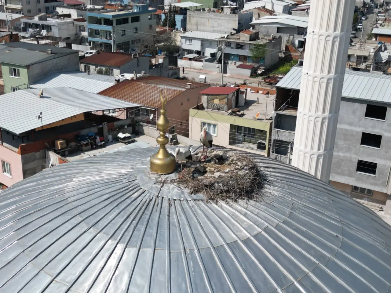 Semt sakinlerinden Şahin Arpacı, leylek yuvasını Drone ile yakından gözlemledi. Farklı açılardan çekilen fotoğraflarla ortaya güzel görüntüler oluştu.