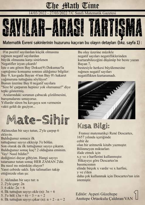 Matematik öğretmeninin verdiği ödev doğrultusunda hazırlayarak 2 sayfalık Matematik Gazetesi çıkardı. Öğrenci Ayperi Güzeltepe, “Öncelikle bu imkanı bana hazırlayan Matematik öğretmenime teşekkür ediyorum. 2 sayfalık gazetemin ön sayfasında matematikle ilgili sorular, ilginç bilgiler, ünlü matematikçilerin hayatlarından kesitler; arka sayfasında ise bulmaca, işlemkaresi ve sudoku var.