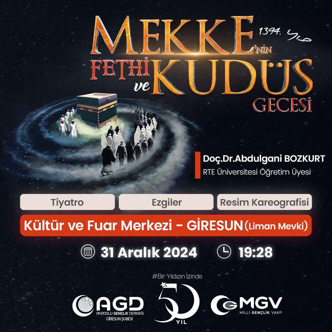 Türkiye’nin en büyük gençlik hareketi olan Anadolu Gençlik Derneği (AGD) - Millî Gençlik Vakfı (MGV), her yıl düzenlediği Mekke’nin Fethi programının 1394’üncü yıl dönümünü "Mekke'nin Fethi ve Kudüs Gecesi" temasıyla düzenleyecek. Vatandaşlar tarafından büyük ilgi gören programlar, bu yıl Filistin’e ve mazlum coğrafyalara destek için Mekke’nin Fethi ve Kudüs Gecesi olarak; tüm Türkiye’de yüzlerce noktada, Avrupa, KKTC ve Azerbaycan’da yoğun katılımlarla gerçekleştirilecek.