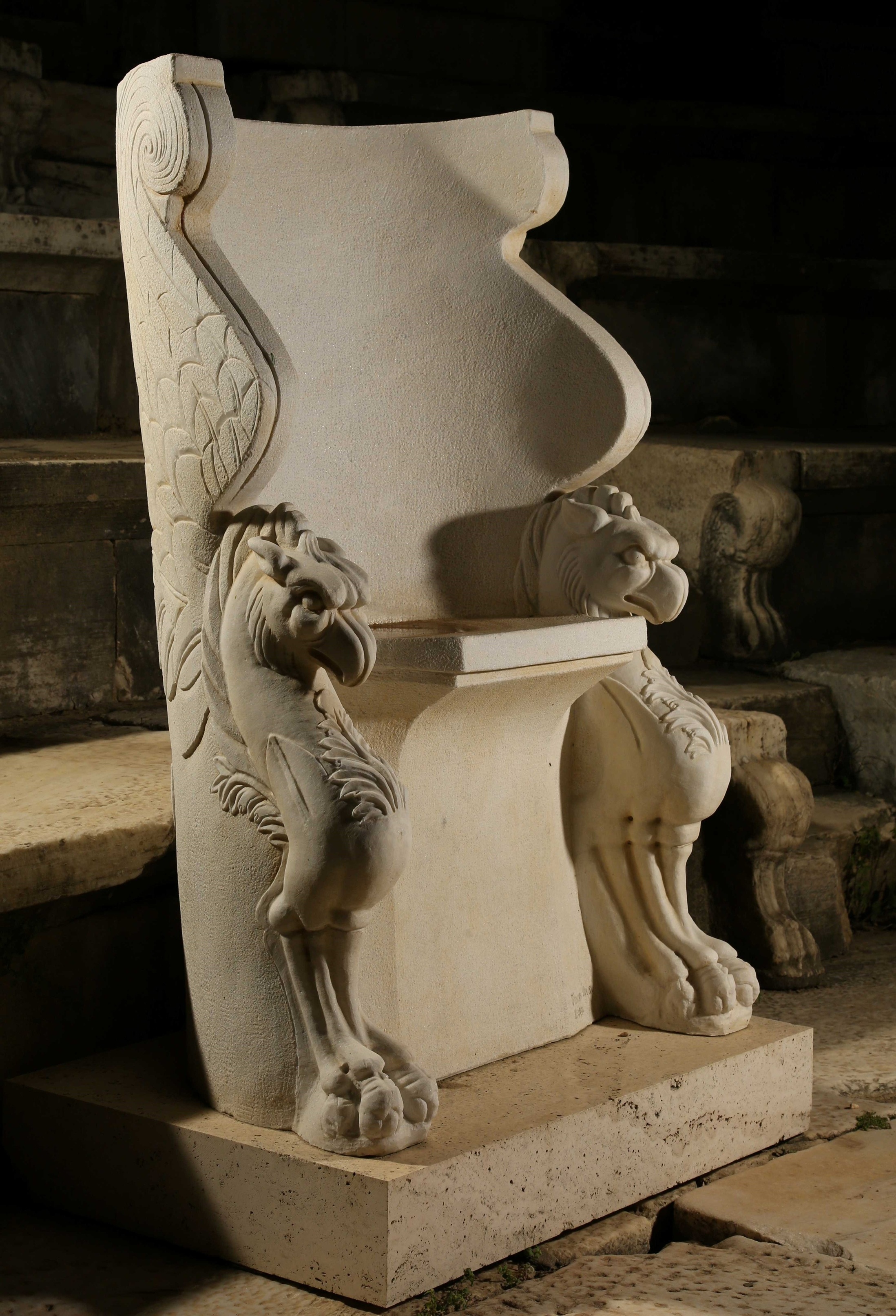 Prof. Dr. Serdar Aybek, tiyatro kazılarında 1994 yılında orijinal yerinde bulunan Grifonlu Koltuk’un Metropolis’in en önemli ve özgün eserlerinden biri olduğunu belirtti ve; “Helenistik Dönem’e tarihlenen ve orkestraya yakın bir konumda yer alan, Türkiye’deki diğer arkeolojik kazılarda benzerine rastlanılmamış bu gösterişli koltuğun iki yanında ayakta duran, kanatları arkaya doğru uzanan grifon figürleri bulunmaktadır. Kartal başlı ve aslan ayaklı bu mitolojik varlıklarla bezeli koltuğun, kentin ileri gelen bir aristokratına ait olduğu düşünülmektedir” dedi.