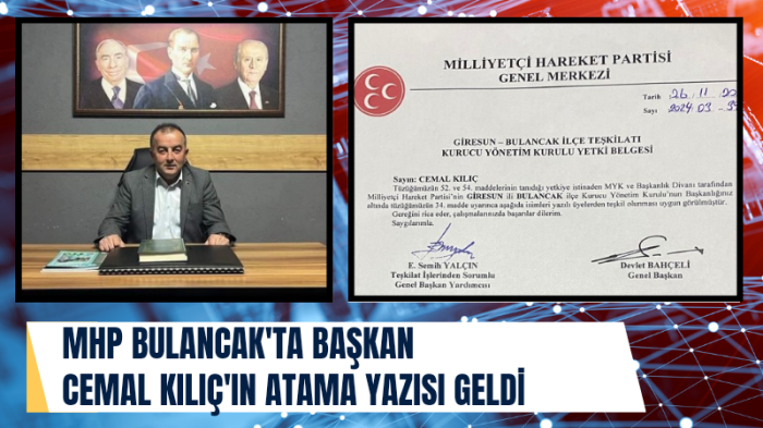 Milliyetçi Hareket Partisi Bulancak İlçe Başkanı olarak bir süre önce görevlendirme alan Cemal Kılıç, resmi olarak atamasının gerçekleştirildiğini açıkladı.