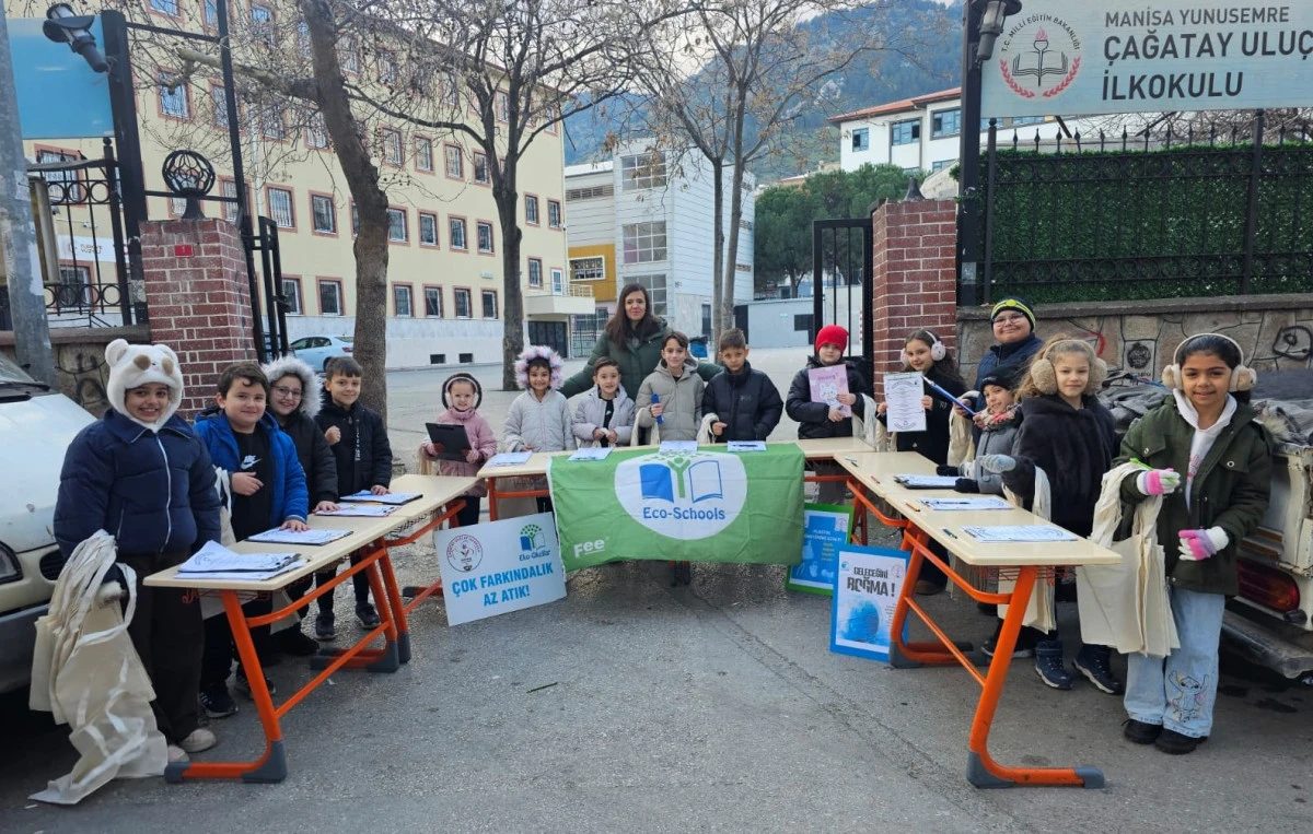 Manisa’da Çağatay Uluçay İlkokulu öğrencileri Eko Okullar Projesi kapsamında çevre bilinciyle ilgili vatandaşları bilgilendirdi.