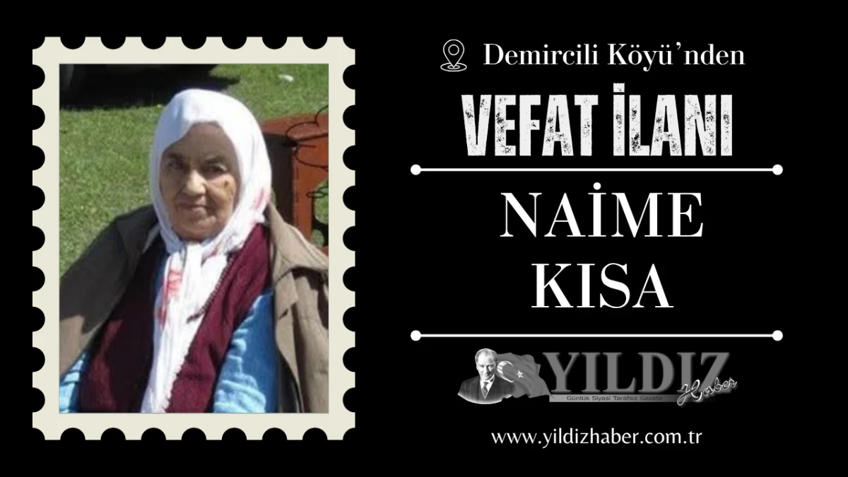 Emekli öğretmen Ahmet Kısa, Mehmet Kısa, Fadime Öztaş, Emine Aydın ve Perihan Yüksel’in anneleri; Çolakoğlu Camii imam hatibi İshak Öztaş’ın anneannesi Naime Kısa vefat etti. Cenazesi 21 Ekim 2025 Salı günü (bugün) öğle namazına müteakip Demircili Köyü Camii’nde kılınacak cenaze namazından sonra aile kabristanlığında toprağa verilecek. www.yildizhaber.com.tr olarak merhumeye Allah’tan rahmet kederli ailesine ve sevenlerine başsağlığı dileriz.