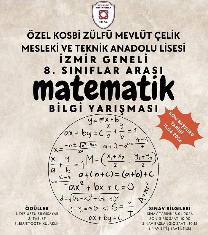 İzmir’de ortaokul öğrencilerinin matematiğe olan ilgisini artırmak ve akademik farkındalık oluşturmak amacıyla anlamlı bir yarışma düzenleniyor. Özel KOSBİ Zülfü Mevlüt Çelik Mesleki ve Teknik Anadolu Lisesi tarafından organize edilen “ İzmir Geneli 8. Sınıflar Arası Matematik Bilgi Yarışması”, farklı okullardan öğrencileri bir araya getirerek genç zihinleri matematik etrafında buluşturacak