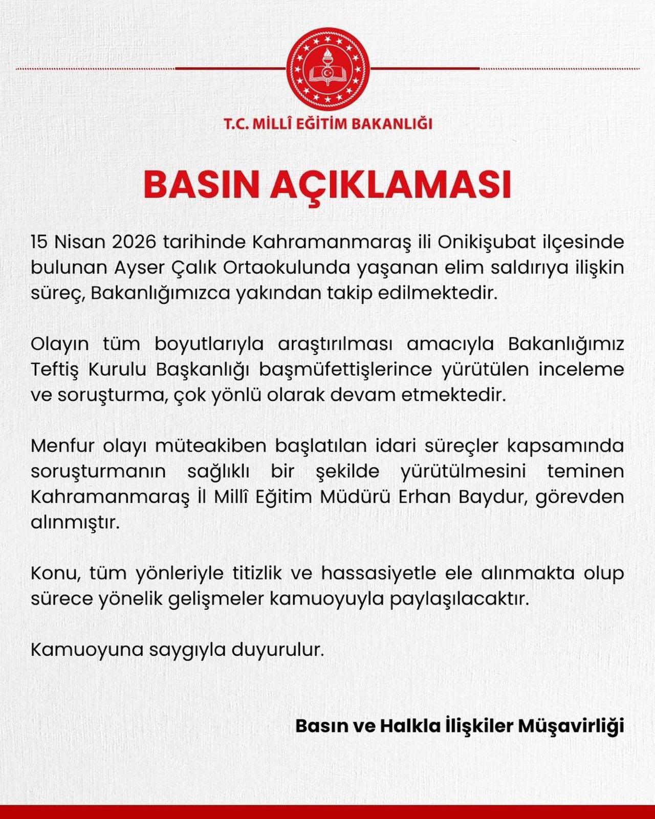 Yaşanan olayın ardından başlatılan idari süreç kapsamında önemli bir karar alındı. Kahramanmaraş İl Millî Eğitim Müdürü Erhan Baydur’un görevden alındığı açıklandı. Bu kararın, soruşturmanın sağlıklı bir şekilde yürütülmesini teminen alındığı vurgulandı.