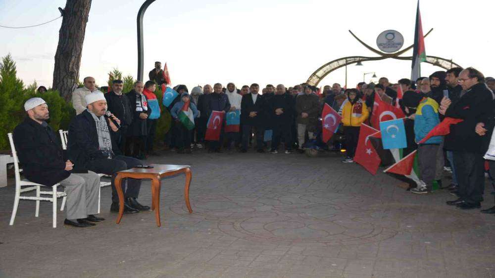 Sabahın ilk saatlerinde bir araya gelen vatandaşlar, ’Dünyayı uyandırıyoruz’, ’Dün Ayasofya, bugün Emevi, yarın Aksa’ ve ’Bir güneş doğuyor’ sloganlarıyla Ünye İskelesi’nde toplantı. Kılınan sabah namazının ardından vatandaşlar, ellerindeki Türk ve Filistin bayrakları, boyunlarına bağladıkları kefiye ve atkılarla Filistin, Doğu Türkistan halkına destek verdi. Vatandaşların yoğun ilgi gösterdiği programda Kur’an-ı Kerim tilaveti yapılarak, dua edildi.