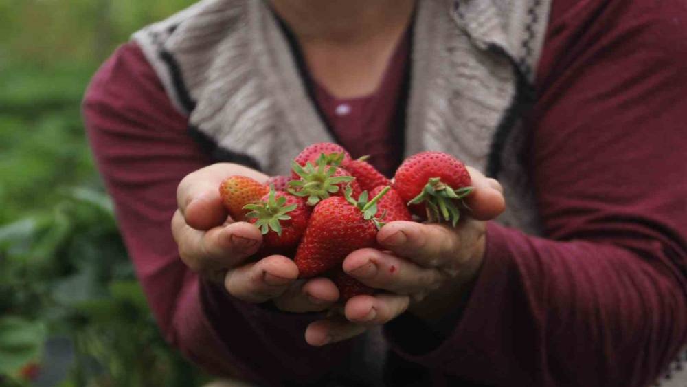 "Burayı dikeli 3 sene oldu. Bu yıl yağmurdan dolayı biraz gecikme oldu ama çilekler şuanda güzelleşti, aroması çok güzel. Havaların durumuna göre kasım ayına kadar hasat sürüyor, biz de burada çalışıyoruz, çileklerimiz organik, yaza doğru daha da tatlı oluyor. Ortam da güzel, hem ekmek parası kazanıyoruz, hem de eğleniyoruz."