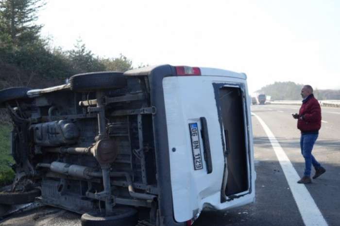 Otoyolda Ankara istikametine seyreden A.G. idaresindeki 06 BN 1129 plakalı minibüs, Hamzabey köyü yakınlarında devrildi.