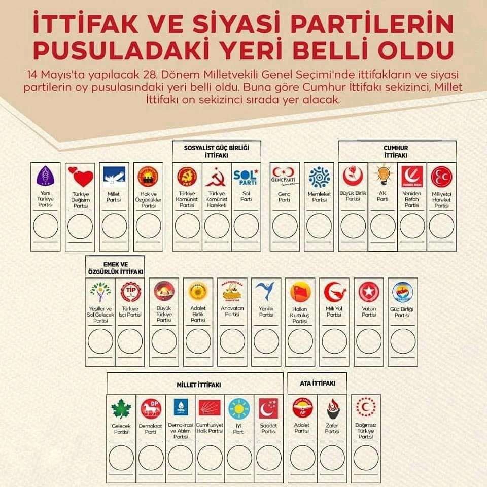 İttifak ve siyasi partilerin pusuladaki yeri belli oldu. "Cumhur İttifakı" sekizinci, "Millet İttifakı" ise on sekizinci sırada yer alacak.