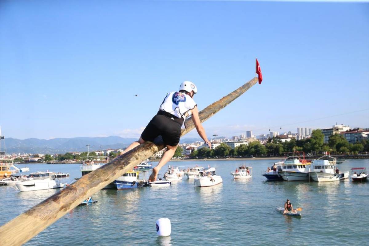 Ordu Büyükşehir Belediyesi işbirliğinde Altınordu ilçesindeki Taşbaşı iskelesinde düzenlenen etkinlikte, yarışmacılar gres yağına bulanmış direğin ucundaki Türk bayrağını almaya çalıştı.