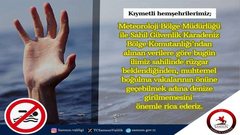 Samsun’da bu sezon 18 kişi boğularak can verdi. Alınan tedbirlere rağmen yaşanan boğulmaların önüne geçebilmek için Samsun Valiliği sık sık uyarılar yapıyor. Bugün yapılan uyarıda ise “Kıymetli hemşehrilerimiz; Meteoroloji Bölge Müdürlüğü ile Sahil Güvenlik Karadeniz Bölge Komutanlığı’ndan alınan verilere göre bugün ilimiz sahilinde rüzgar beklendiğinden, muhtemel boğulma vakalarının önüne geçebilmek adına denize girilmemesini önemle rica ederiz” denildi.