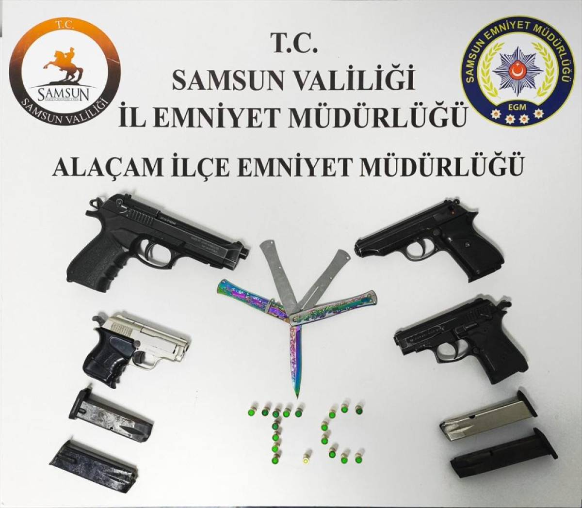 Aramada 2 ruhsatsız tabanca, 2 kurusıkı tabanca, bir amaç dışı bıçak ve 18 kurusıkı tabanca fişeği ele geçirildi.