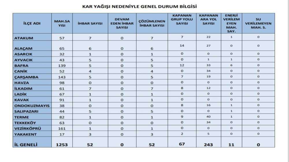 Altay kar fırtınası ülkeyi etkisi altına alırken, Samsun da kuvvetli kar yağışından nasibini aldı. Etkili olan kar yağışı nedeniyle 67 mahalle grup yolu ve 243 ara yol ulaşıma kapandı. Atakum’da 7, Alaçam’da 14, Bafra’da 12, Çarşamba’da 7, İlkadım’da 8, Ondokuzmayıs’ta 8, Terme’de 9 ve Yakakent’te 2 grup yolunda kar temizleme çalışmaları sürüyor.