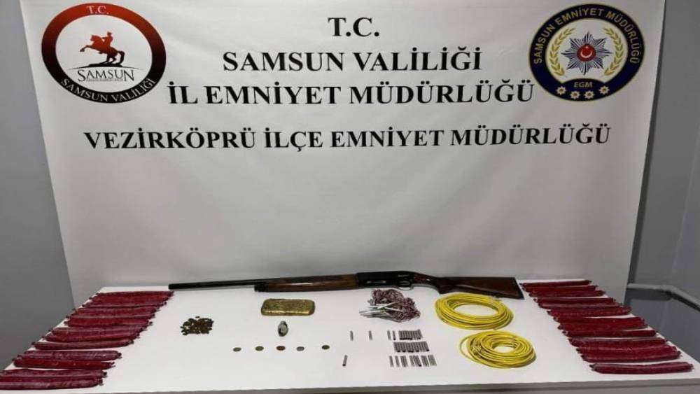 Edinilen bilgiye göre, Vezirköprü İlçe Emniyet Müdürlüğü ekiplerinin takibi sonucu M.D. isimli şahsın aracında ve ikametinde arama yapıldı. Yaplan aramalarda, 4 adet Roma ve Helenistik döneme ait sikke, 1 adet Osmanlı dönemine ait 10 para, 1 adet gözyaşı şişesi, 26 adet kapsüle duyarlı patlayıcı, 75 adet top barutu, 30 adet elektrikli infilak kapsülü, 38 adet infilak kapsülü, 20-25 metre saniyeli fitil, 1 adet altın sarısı renkli metal külçe, metal detektörü kullanım klavuzu ve 1 adet ruhsatsız tüfek ele geçirildi. Olayla ilgili M.D. gözaltına alındı. Soruşturma devam ediyor.