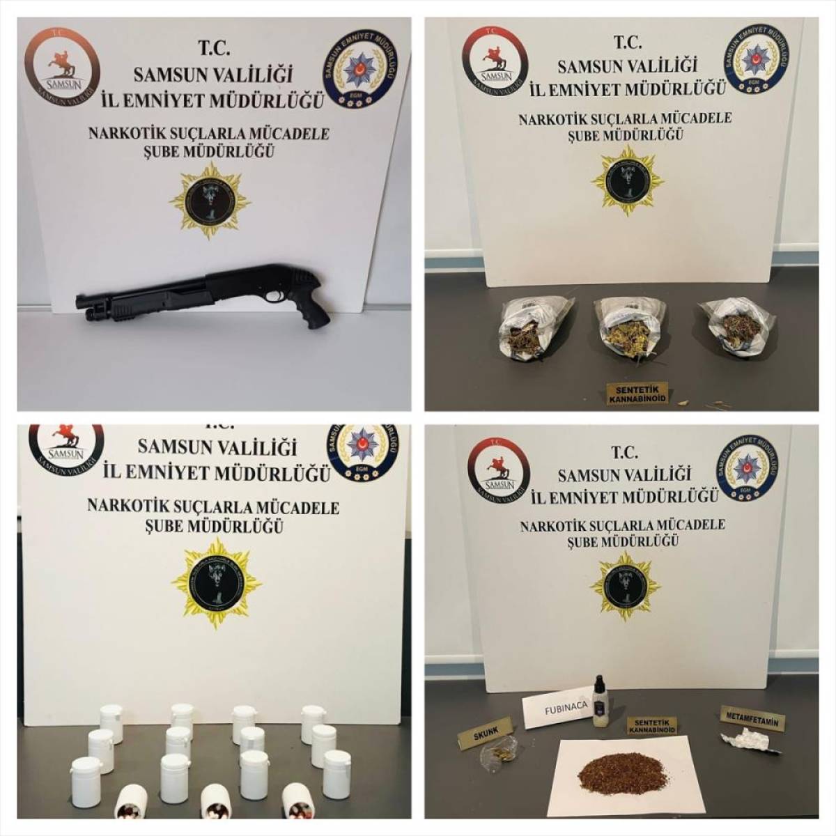 Belirlenen adreslerde yapılan aramada 938 sentetik ecza hapı, 286,64 gram sentetik uyuşturucu ile pompalı tüfek ele geçirildi.