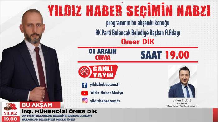 Yıldız Haber Yazı İşleri Müdürü Sinan Yıldız'ın moderatörlüğünde gerçekleşecek Seçimin Nabzı programının 12. Bölümünde 2019 seçimlerinde AK Parti’den Belediye Meclis Üyeliğine seçilen İnşaat Mühendisi ve AK Parti Bulancak belediye Başkan Aday Adayı Ömer Dik, Yazı İşleri Müdürümüz Sinan Yıldız’ın sorularını yanıtlayacak.