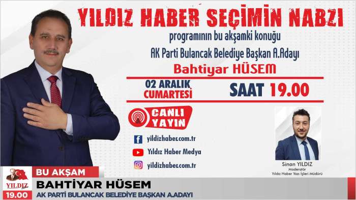Yıldız Haber Yazı İşleri Müdürü Sinan Yıldız'ın moderatörlüğünde gerçekleşecek Seçimin Nabzı programının 13. Bölümünde 2016 yılından bu yana Bulancak Belediye Başkan Yardımcılığı görevinde bulunan ve AK Parti’den Bulancak belediye Başkan Aday Adayı olan Bahtiyar Hüsem, Yazı İşleri Müdürümüz Sinan Yıldız’ın sorularını yanıtlayacak.