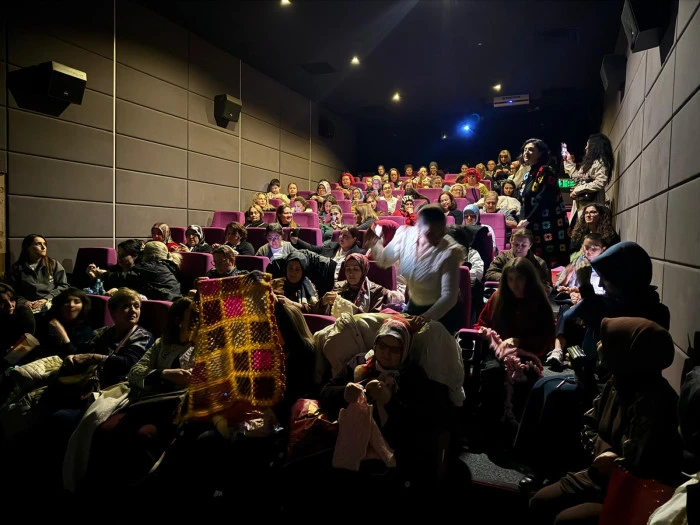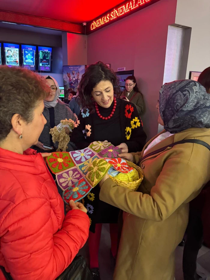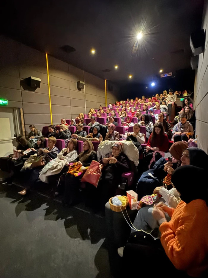 Barbaros İlkokulu okul öncesi öğretmeni Fatma Ezgi Yaşar Yonkuç yaptığı öncülükle sinema salonunda yaklaşık 100 kadın ile örgü örerek anlamlı bir etkinliğe daha imza attı.
