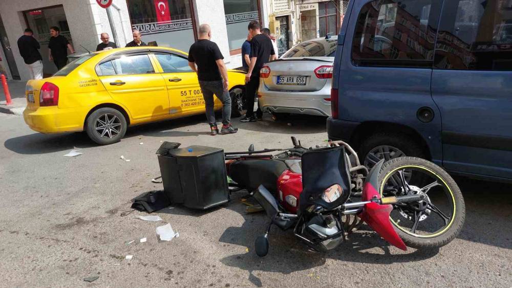 Samsun’da taksinin çarptığı motosikletli kurye ağır yaralanırken, kaza anı ise güvenlik kamerasına yansıdı.