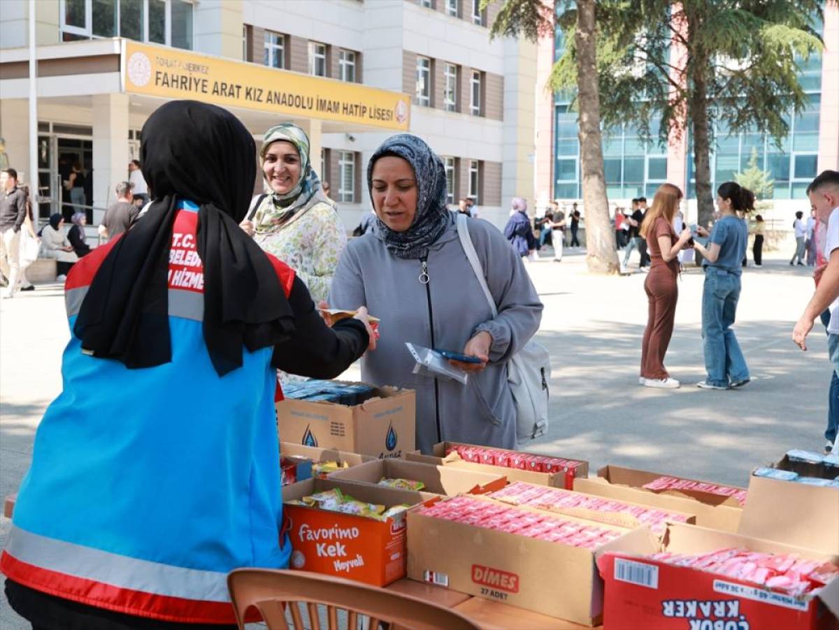 Tokat Belediyesi, Yükseköğretim Kurumları Sınavı'nın (YKS) ilk oturumu olan Temel Yeterlilik Testi'ne (TYT) giren öğrencilerin yakınlarına su, meyve suyu, simit ve kraker ikramında bulundu.