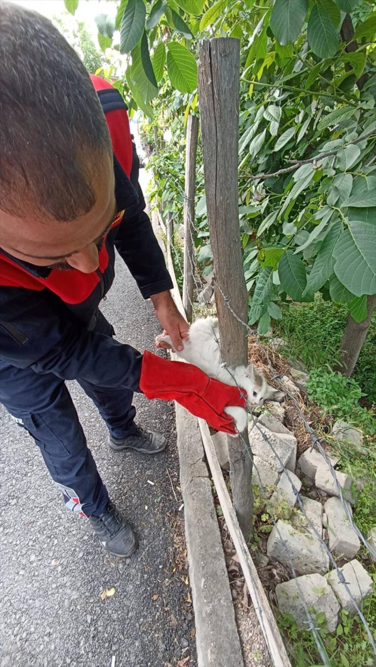 Tokat'ta bahçedeki çite sıkışan kedi kurtarıldı