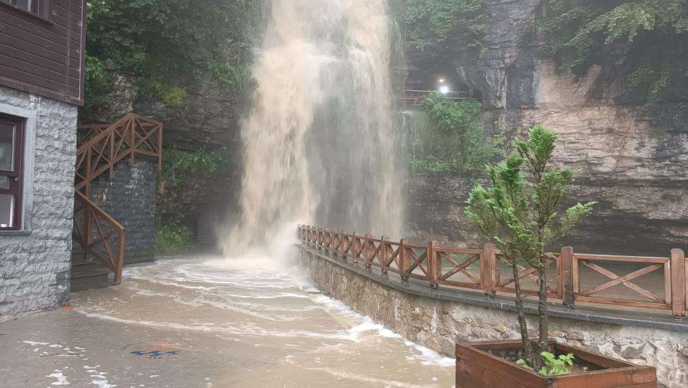 TRABZON (AA) - Trabzon'un Düzköy ilçesindeki turizm merkezi Çal Mağarası, sağanak sonucu debisi yükselen şelale sebebiyle girişlere kapatıldı.