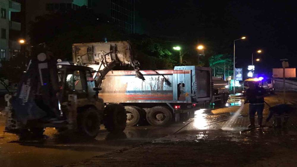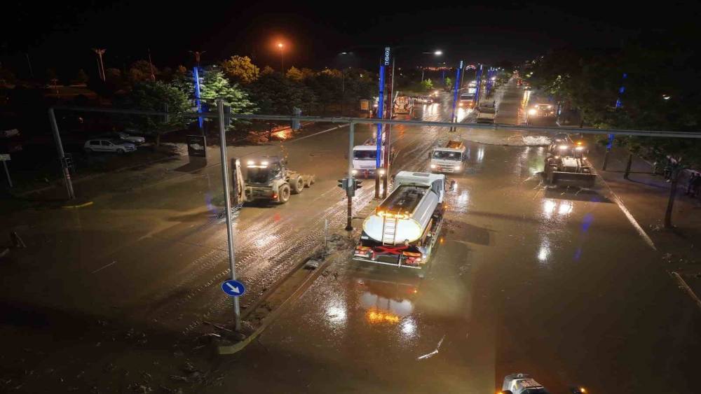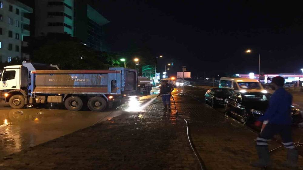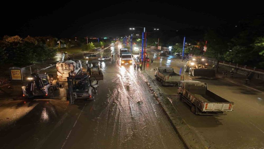 Şehrin en hareketli bölgeleri olan iki noktada selin getirdiği çamur birikintilerinin temizlenmesi için yoğun çaba harcayan Büyükşehir Belediyesi ekiplerinin çalışmalarının sabaha kadar süreceği öğrenildi.