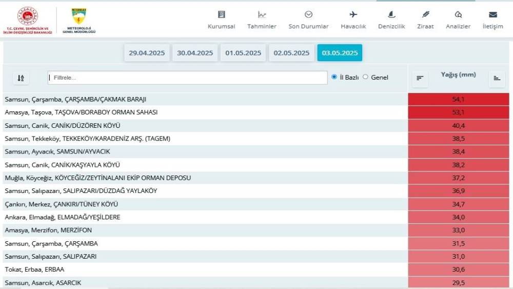 Samsun’a içme suyu sağlayan Çakmak Barajı’nın bulunduğu bölgede metrekareye 54,1 kilogram yağış düşerken, Samsun’u Amasya (53,1 kg), Muğla (37,2 kg), Çankırı (34,7 kg) ve Ankara (34 kg) izledi.