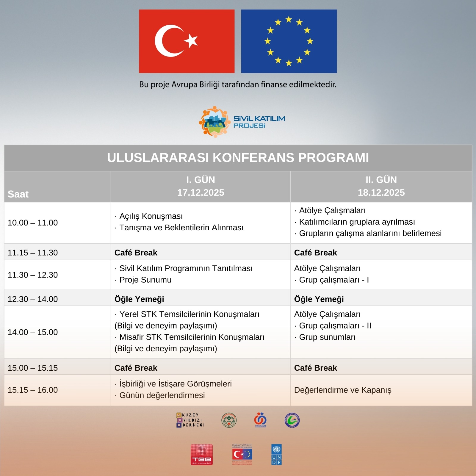 Birleşmiş Milletler Kalkınma Programı (UNDP) tarafından uygulanmakta olan Sivil Katılım Hibe Programı kapsamında desteklenen ve Kuzey Yıldızı Derneği tarafından yürütülen “ Giresun Ordu Sivil İnisiyatif Stratejik Araştırma Merkezi (GO SİSAM)” isimli proje kapsamında “Uluslararası Konferans” düzenlenecek.17- 18 Aralık 2025 tarihlerinde Ramada Otel'de düzenlenecek olan konferansa katılmak isteyenler için son başvuru tarihinin 12 Aralık 2025 Cuma günü saat 17.00 olduğu bildirildi.Başvuruların tamamlanmasının ardındın katılım onayının ise e- posta ile başvuru sahiplerine ulaştırılacağı duyuruldu.