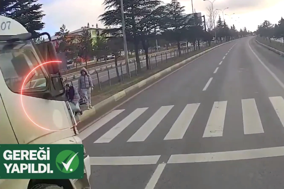 Videoda gördüğünüz gibi yaya geçidinden geçmeye çalışan yayalara, sağ taraftaki araç yol verirken, sol taraftan hızla gelen kamyon az kalsın çarpıyordu.